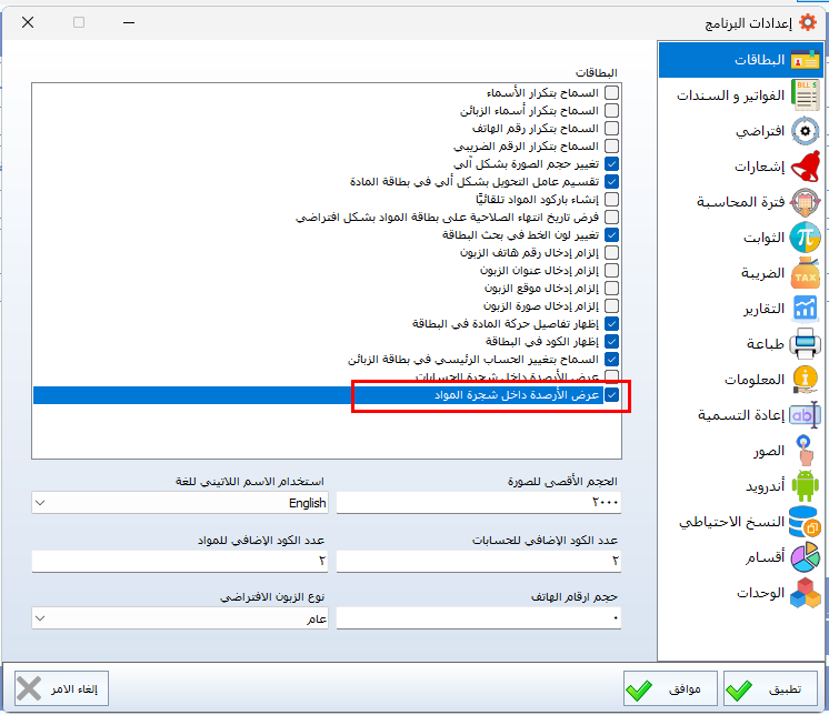 يتيح البرنامج إمكانية عرض أرصدة المواد مباشرة داخل دليل المواد (شجرة المواد)، وذلك من خلال إعدادات البرنامج عبر تفعيل خيار عرض الأرصدة داخل شجرة المواد، مما يساعد على متابعة كميات المخزون بسهولة وبشكل فوري.
