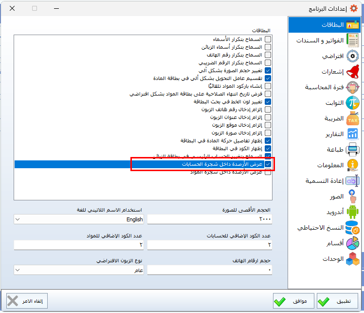 يتيح النظام إمكانية عرض أرصدة الحسابات مباشرة داخل دليل الحسابات (شجرة الحسابات)، وذلك لتسهيل الاطلاع السريع على الوضع المالي لكل حساب. ويتم تفعيل هذه الخاصية من خلال إعدادات البرنامج، عن طريق اختيار خيار تفعيل عرض الأرصدة داخل شجرة الحسابات، مما يساعد المستخدم على متابعة الأرصدة دون الحاجة إلى الانتقال إلى تقارير مستقلة.