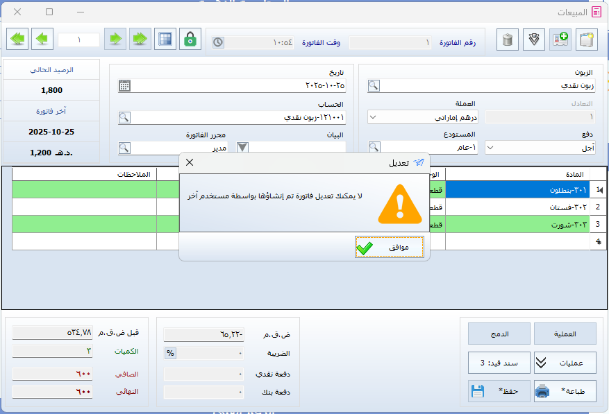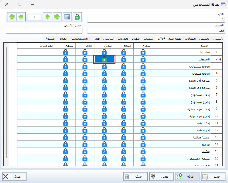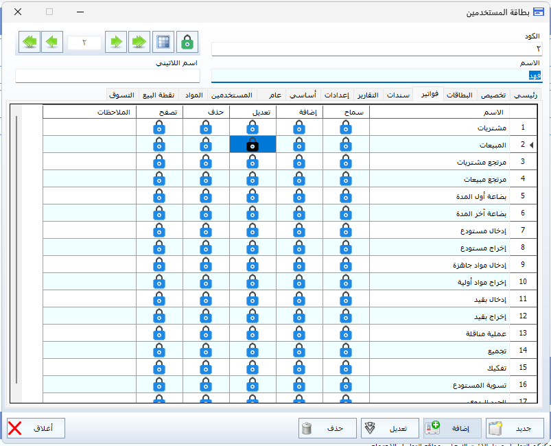 تشمل الصلاحيات التي تسمح للمستخدم بإضافة وتعديل وحذف البيانات داخل النظام، مثل الفواتير والبطاقات والسندات