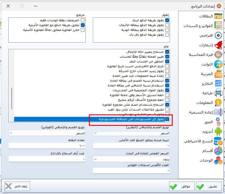 يجب التأكد من تفعيل خيار إظهار جميع المستودعات عند تنفيذ المناقلة المستودعية، وذلك لضمان ظهور كافة المستودعات وإتاحة الاختيار بينها بشكل كامل أثناء عملية المناقلة