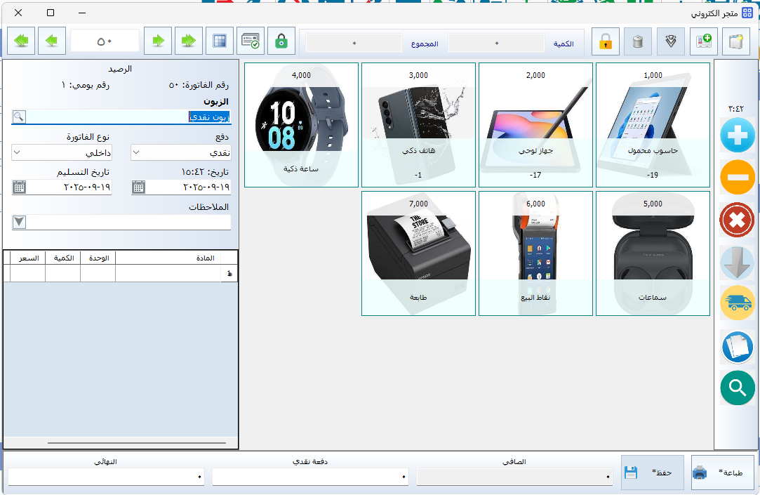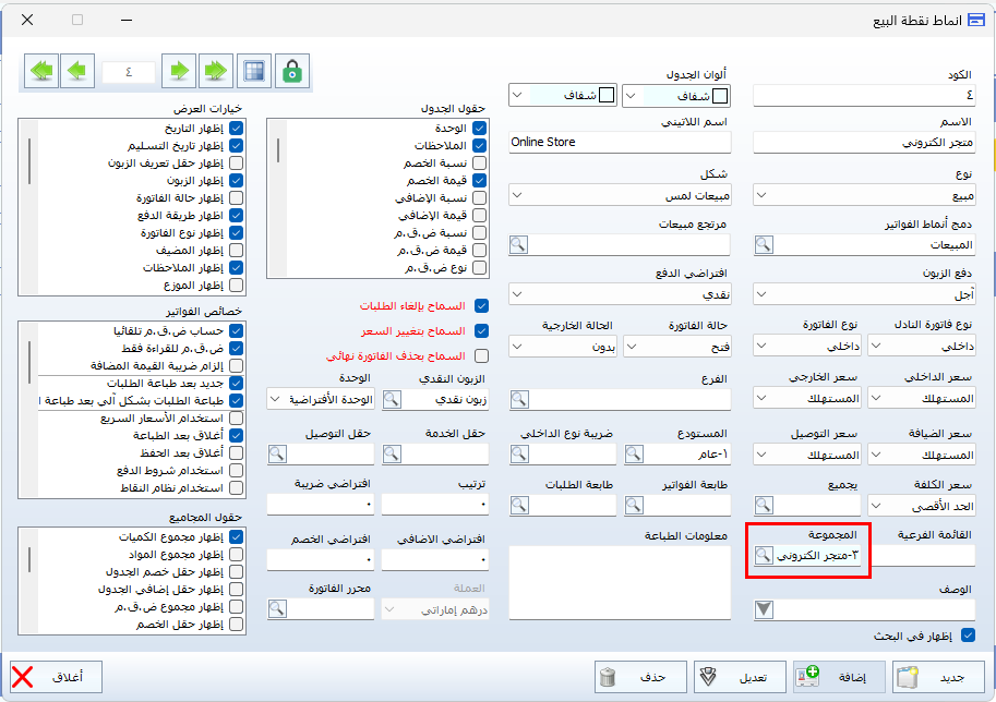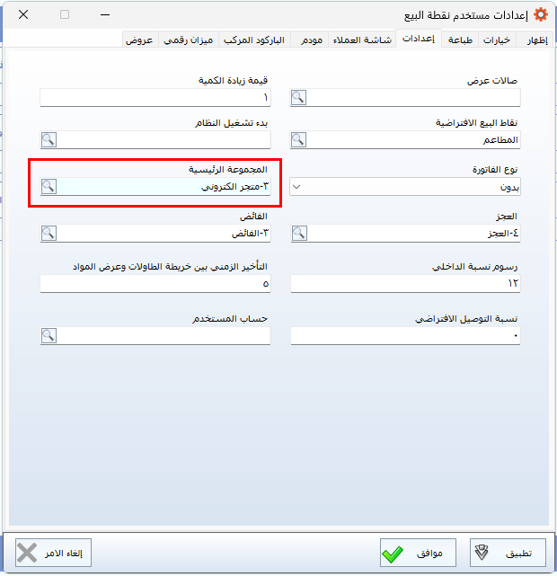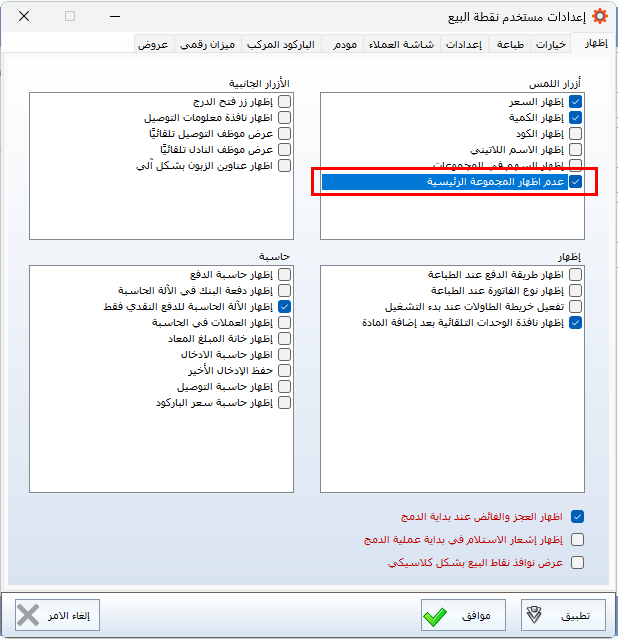 يمكن ضبط النظام لعرض مجموعة معينة من المواد داخل شاشة نقاط البيع، وذلك إمّا باختيار مجموعة عادية أو مجموعة رئيسية. عندها تُعرض المواد التابعة لتلك المجموعة فقط، بينما يتم إخفاء بقية المواد. وتفيد هذه الخاصية في تخصيص المواد المعروضة لكل فرع أو مستخدم حسب الحاجة.