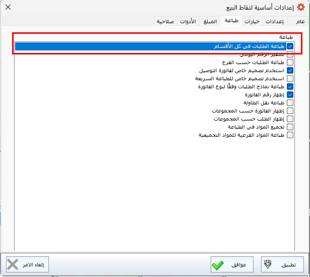ولهذا الغرض، يتيح النظام خيارًا إضافيًا تحت اسم "طباعة الطلبات في كل الأقسام".