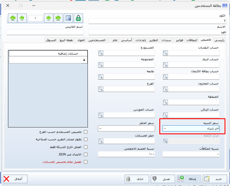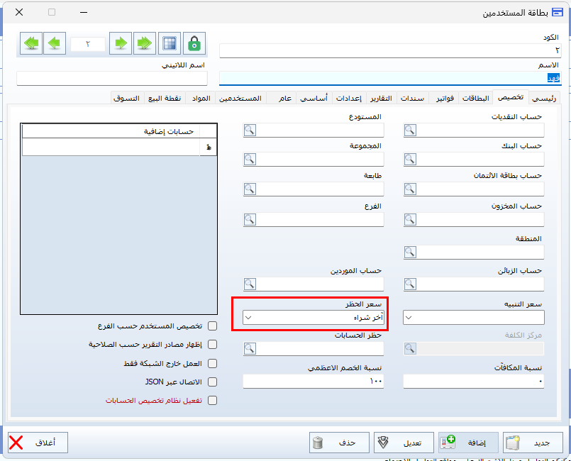 يُتيح النظام ميزة التحكم في البيع بأسعار أقل من سعر الكلفة من خلال تحديد نوعين من الأسعار في بطاقة المستخدم: سعر التنبيه وسعر المنع.