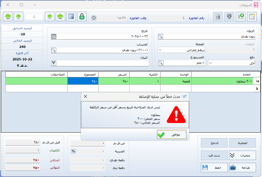 ففي حال محاولة البيع بسعر أدنى من الكلفة، يقوم النظام بعرض رسالة توضيحية تُفيد بعدم السماح بإتمام عملية البيع، ولا يمكن للمستخدم المتابعة إلا بعد تعديل السعر ليصبح أعلى من سعر الكلفة.