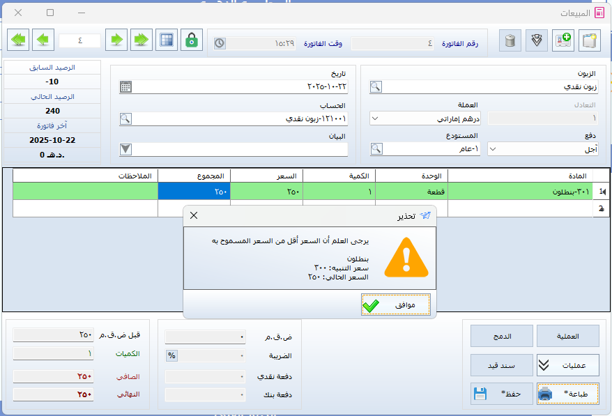 فعند إدخال سعر بيع أقل من سعر الكلفة، يقوم النظام بعرض رسالة تحذيرية تُنبه المستخدم إلى أن السعر أقل من الكلفة، لكنه يُتيح له الاستمرار في عملية البيع بعد التأكيد.