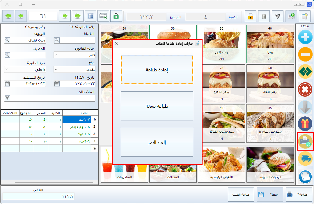 يوفر نظام نقاط البيع إمكانية إعادة طباعة الطلبات أو طباعة نسخة منها بسهولة من خلال تفعيل إعداد بسيط داخل النظام.