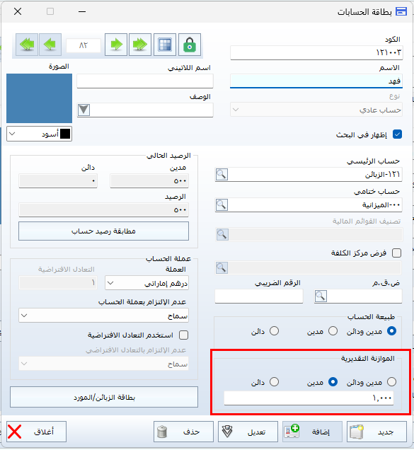 يمكن ضبط الحد الأقصى للرصيد الآجل (الرصيد الأعظمي) لكل عميل من خلال بطاقة الحسابات، وذلك باتباع الخطوات التالية: