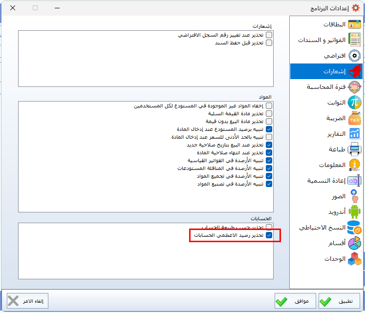 تفعيل التنبيه عند تجاوز الرصيد الأعظمي