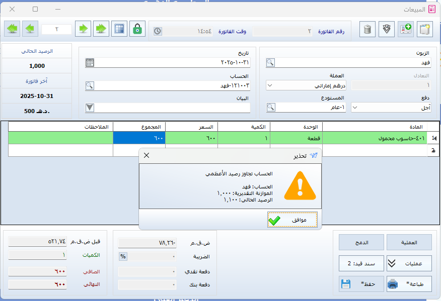 بعد التفعيل، سيظهر تنبيه للمستخدم في حال تجاوز العميل للرصيد المحدد أثناء عملية البيع، دون أن يمنع النظام تنفيذ العملية (أي تنبيه فقط).