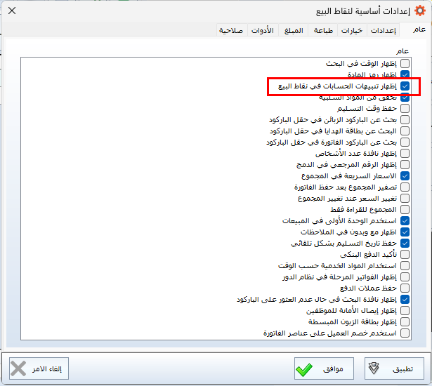 لتمكين النظام من إصدار تنبيه عند محاولة البيع للعميل برصيد يتجاوز الحد المسموح به: