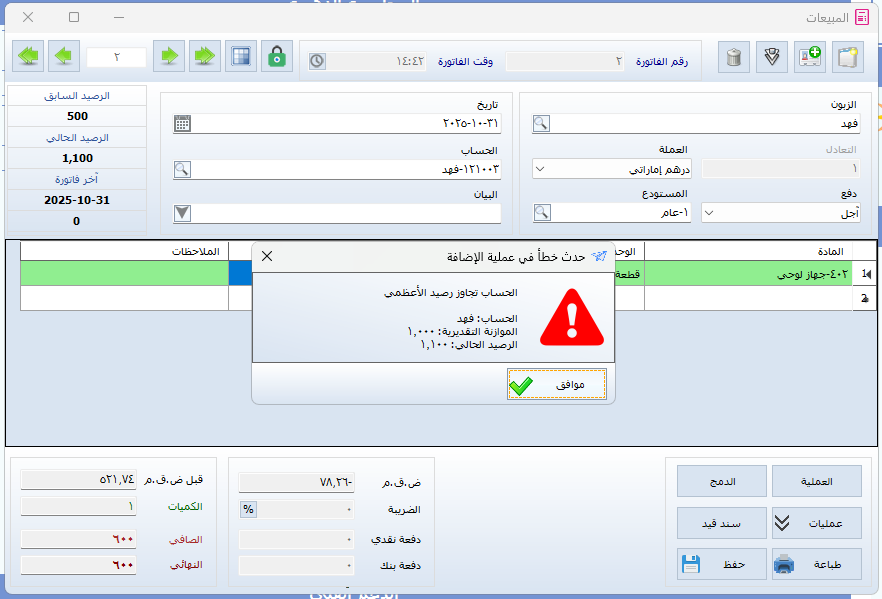 وبذلك، إذا حاول المستخدم تنفيذ بيع يتجاوز الحد المسموح به، سيظهر له تنبيه بالمنع ولن يتمكن من إتمام العملية.