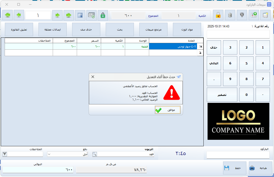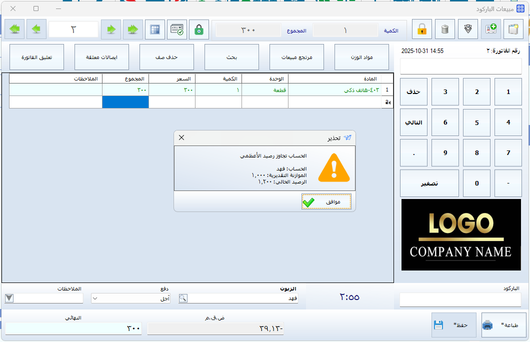 وبهذا يتم عرض التنبيهات أو المنع مباشرة ضمن واجهة نقطة البيع عند تجاوز الرصيد الأعظمي للعميل.