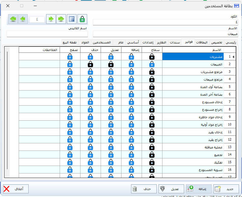 نقوم بإلغاء جميع الصلاحيات لهذا المستخدم، مع الإبقاء فقط على صلاحية إضافة فاتورة مبيعات وصلاحية استعراض الفواتير.
