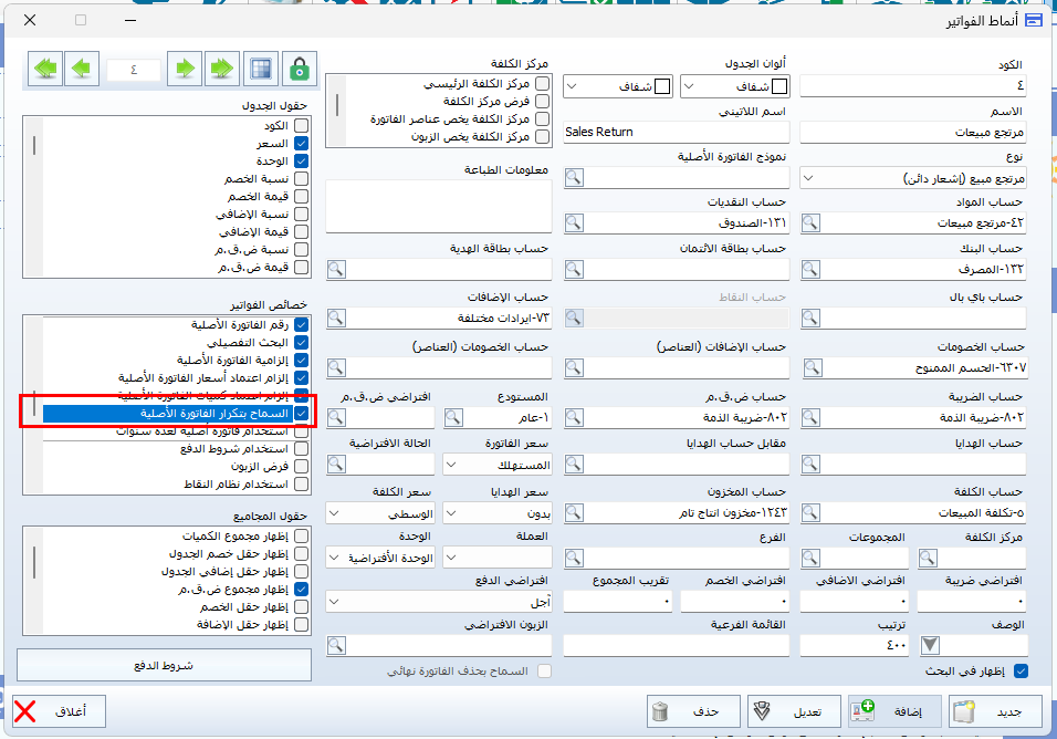 بعد تفعيل هذا الخيار، سيتيح لك النظام إدراج عدة فواتير مرتجع داخل فاتورة مبيعات واحدة دون أي قيود.