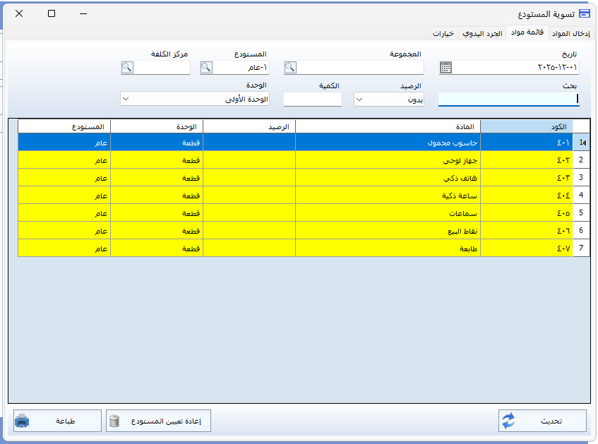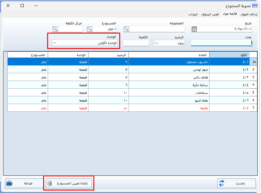 وبذلك، تصبح النتيجة النهائية لجميع المواد = صفر تمامًا في المستودع المحدد.