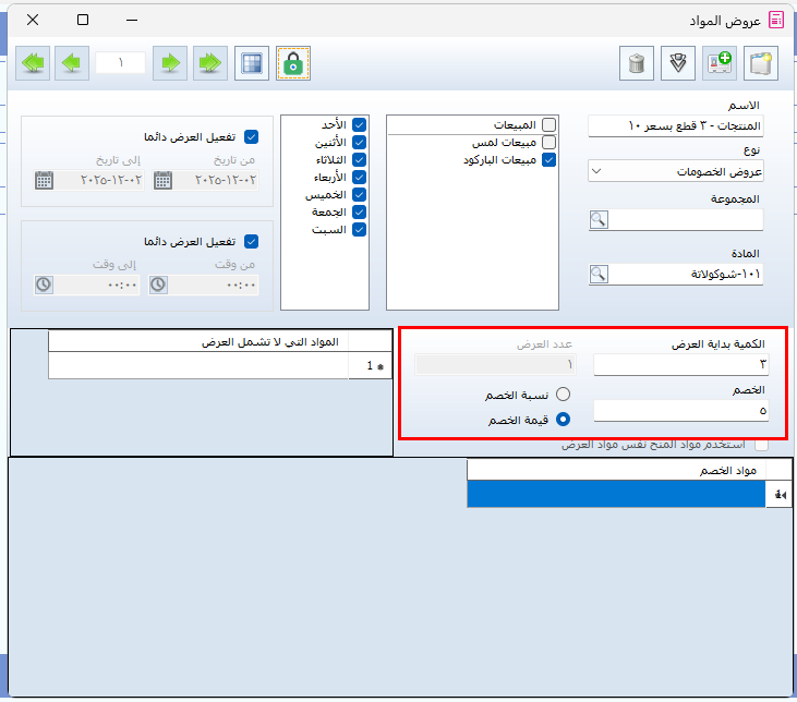 - تحديد المادة أو المنتج المراد تطبيق العرض عليه.