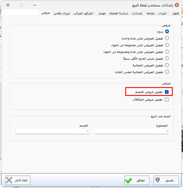 يجب التأكد من تفعيل عرض الخصم من إعدادات البرنامج للمستخدم، وإلا لن يتم تنفيذ الخصم تلقائيًا عند تلبية شروط العرض.