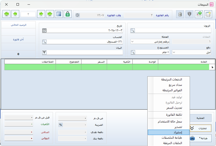 - افتح النمط الذي ترغب في استيراد الفواتير إليه (مثل مبيعات، مشتريات، مرتجع…).