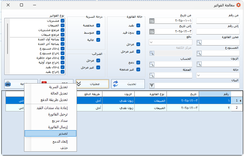 ثانياً: تصدير مجموعة من الفواتير