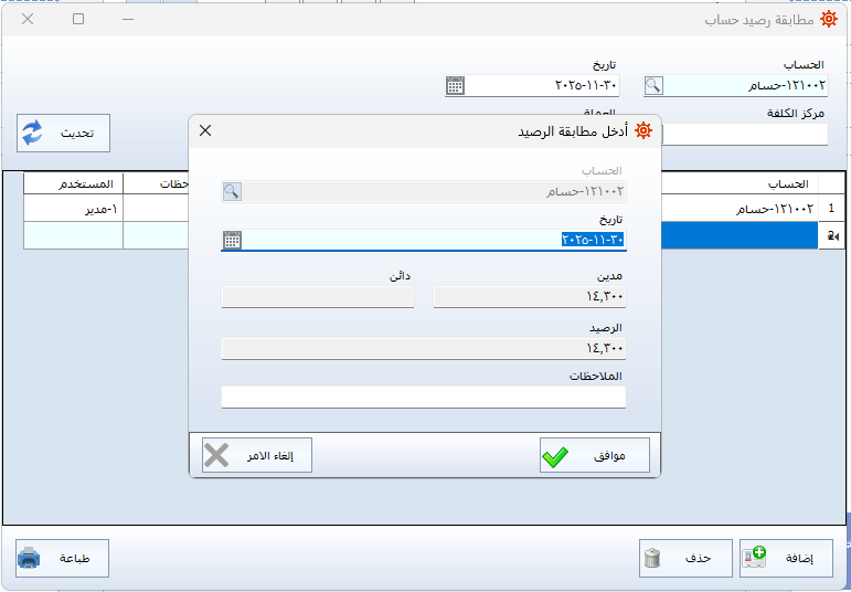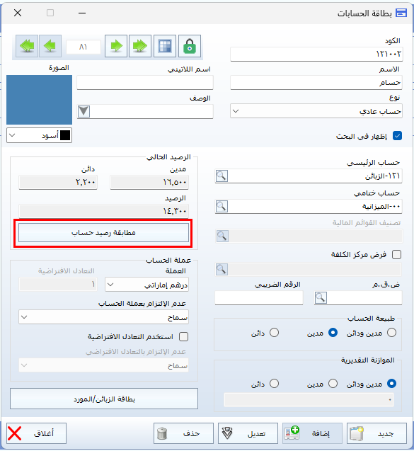 - الضغط على خيار مطابقة رصيد الحساب لتظهر واجهة المطابقة.