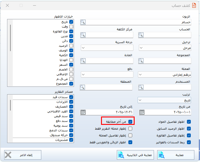 بهذه الطريقة، يتم إدخال المطابقة للرصيد مع العميل أو المورد في البرنامج. وعند الاطلاع على أي تقرير مالي، مثل كشف الحساب، يمكن تحديد آخر مطابقة، ليظهر في التقرير الحركات الجديدة فقط، بينما يتم احتساب الرصيد السابق على أساس آخر مطابقة.