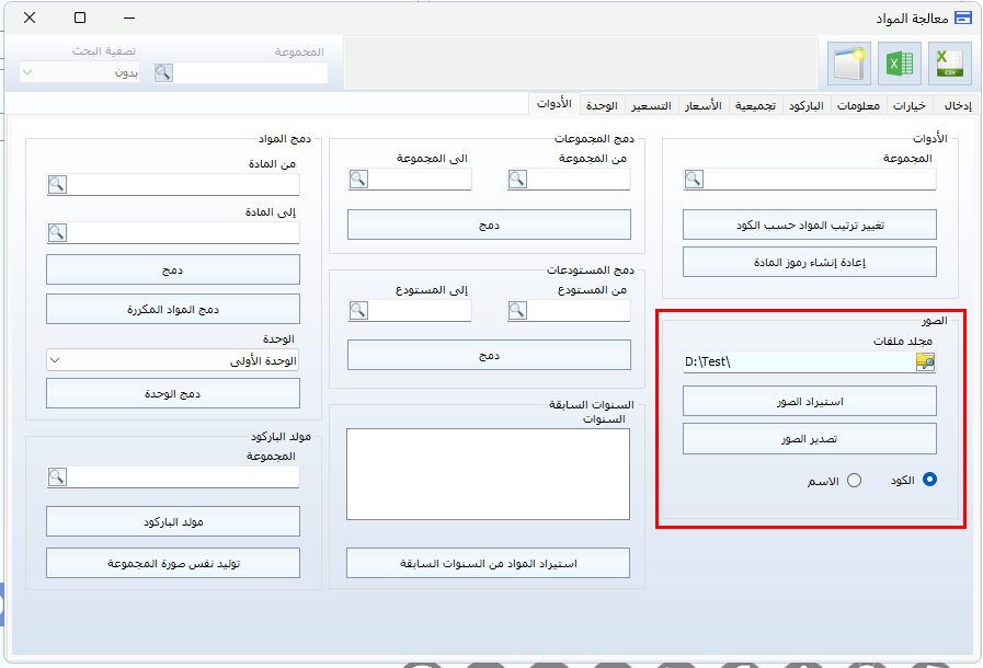 - في حالة الاستيراد: يتم الضغط على زر "استيراد الصور" ليبدأ البرنامج في قراءة الصور وربطها بالمواد.