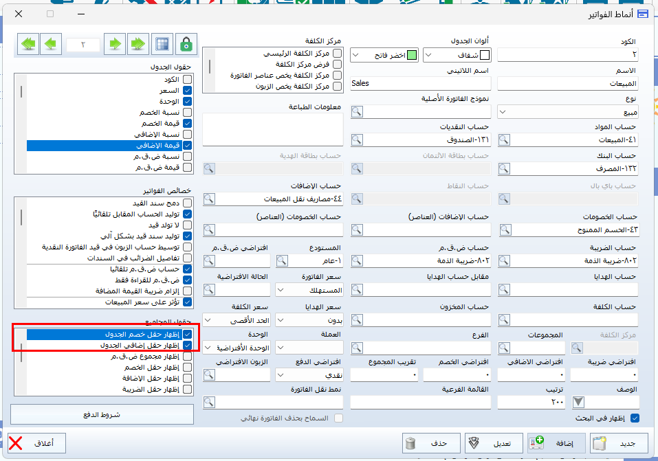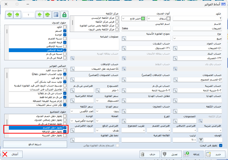 يتيح النظام إمكانية إظهار وتطبيق الخصم والإضافي في الفواتير بطريقتين مختلفتين، وذلك بحسب تأثير الخصم أو الإضافة على الضريبة على القيمة المضافة أو على إجمالي الفاتورة فقط. وفيما يلي توضيح كل نوع وآلية استخدامه وتفعيله: