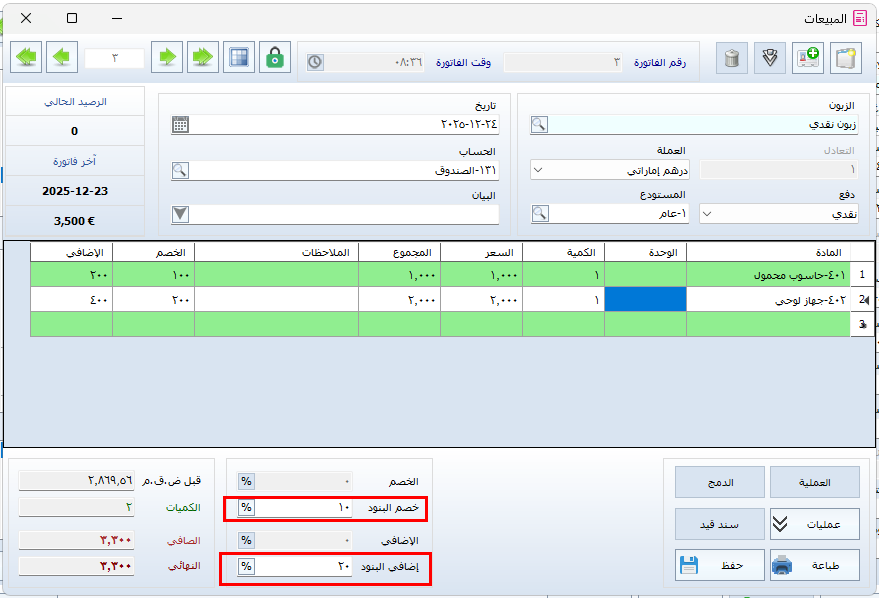 ثانيًا: خصم وإضافي إجمالي الفاتورة