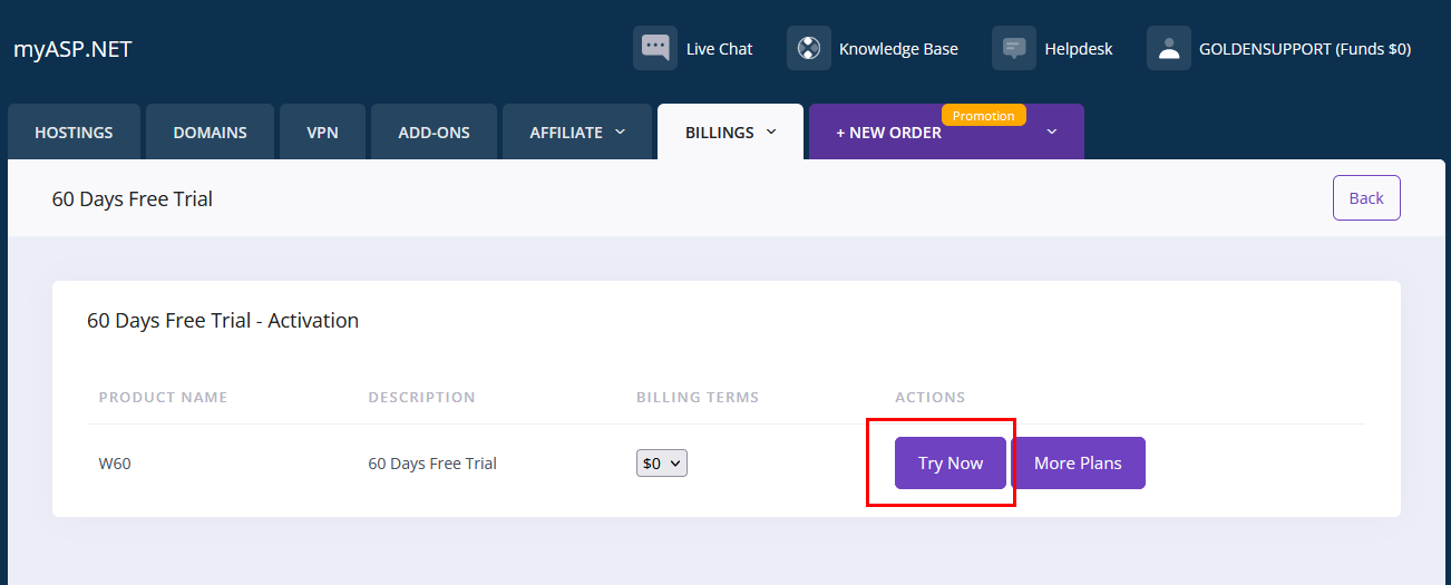 بعد تسجيل الدخول، نقوم بالضغط على زر Try Now لتفعيل الخطة المجانية لمدة 60 يومًا.