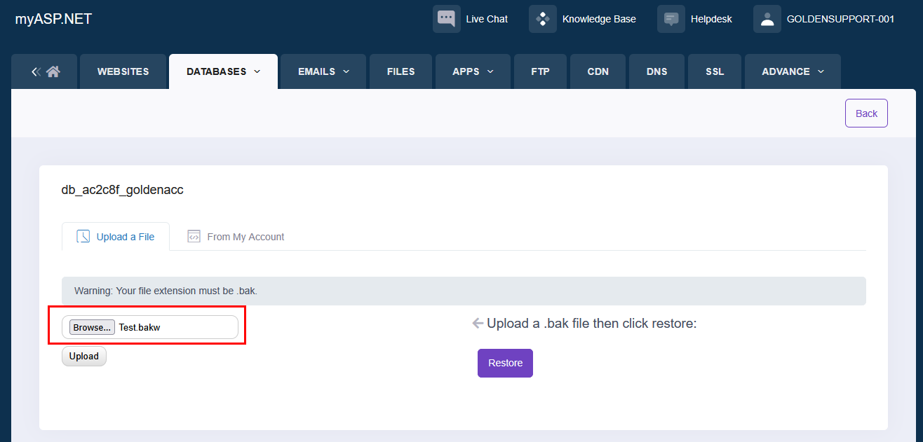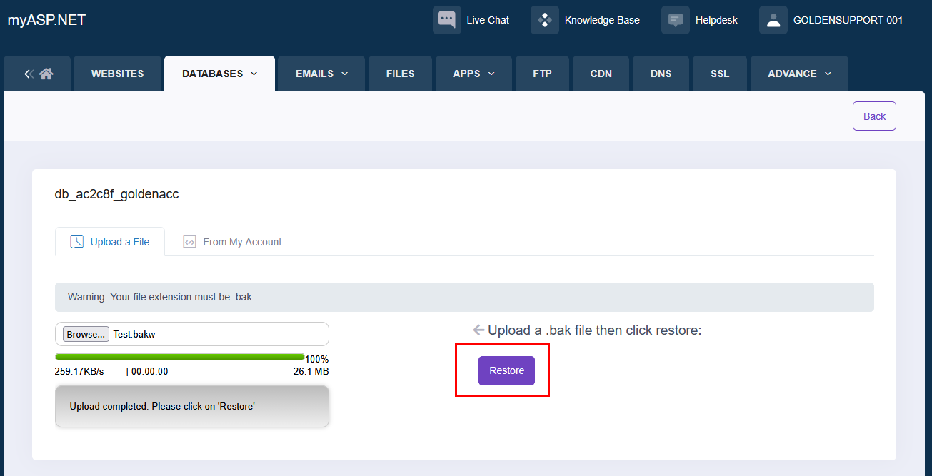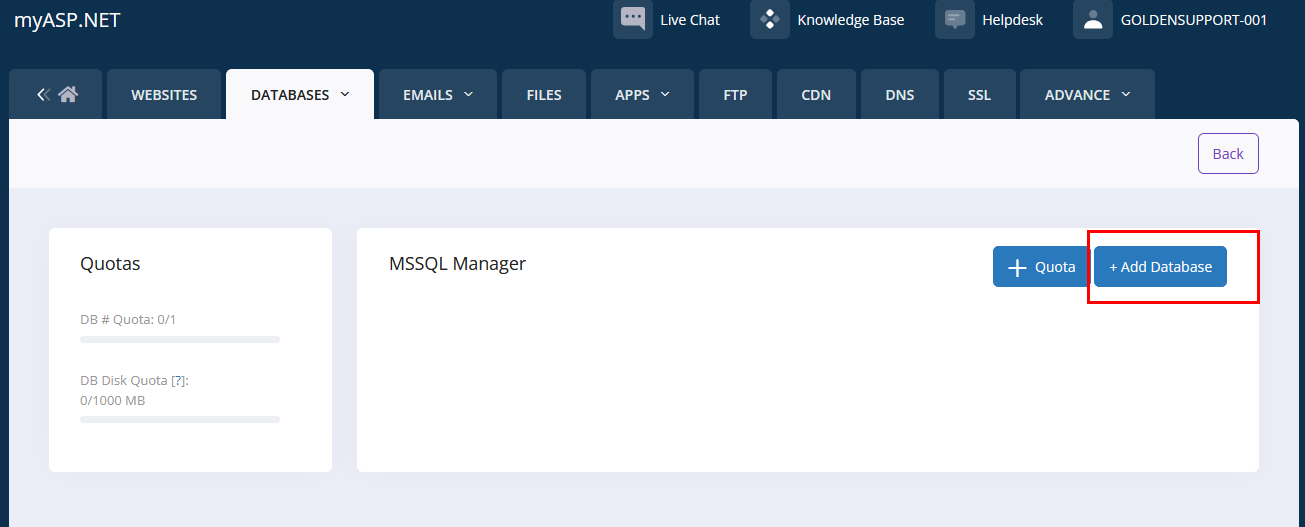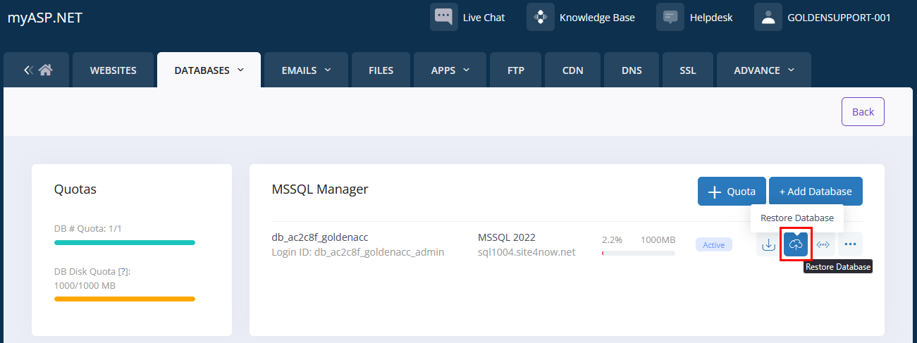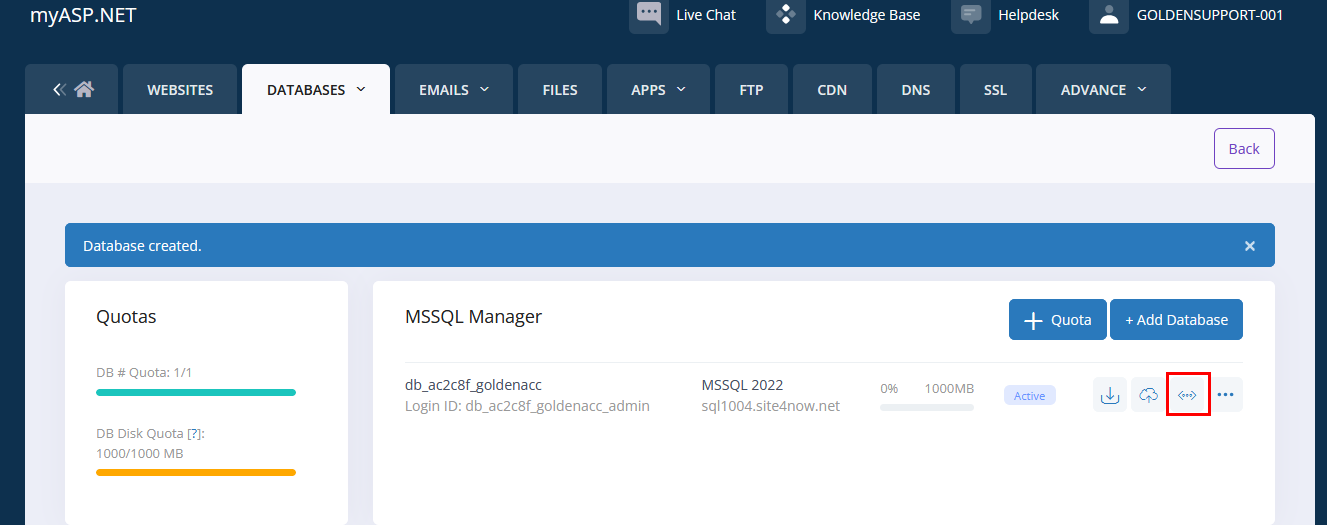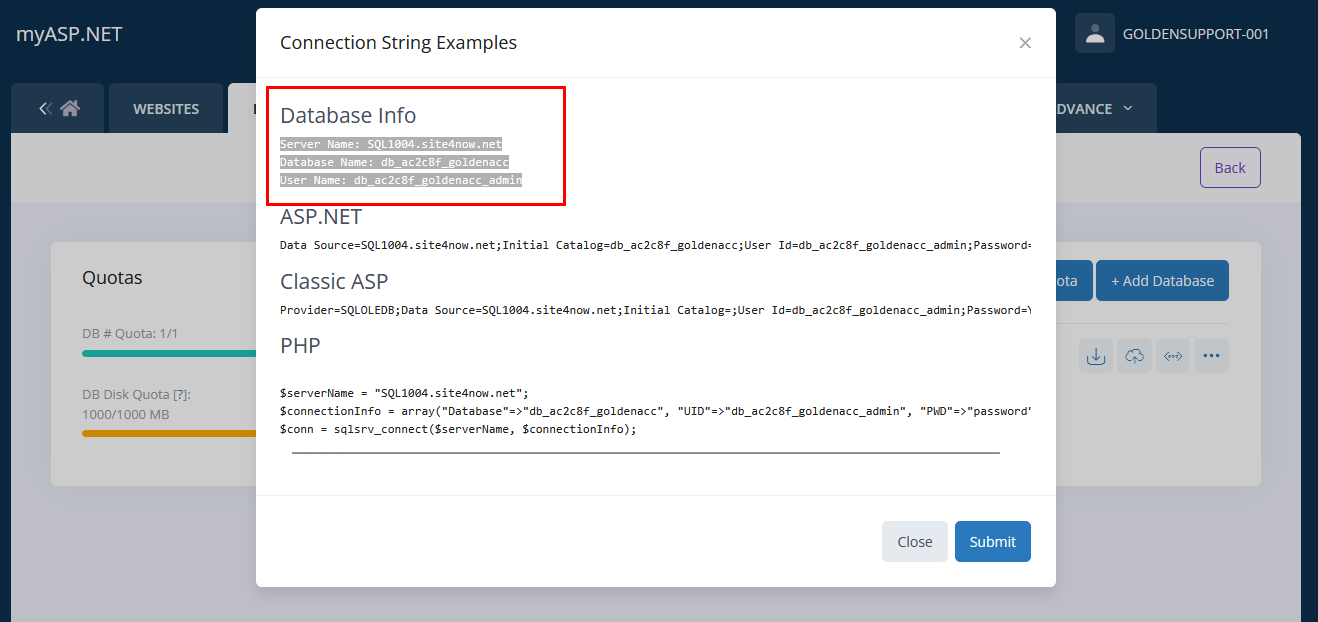 يُستخدم موقع MyASP لاستضافة قواعد البيانات، مما يتيح ربط برنامج المحاسبة الذهبية بقاعدة بيانات تعمل عبر الإنترنت، بما يضمن سهولة الوصول والاستقرار في العمل.