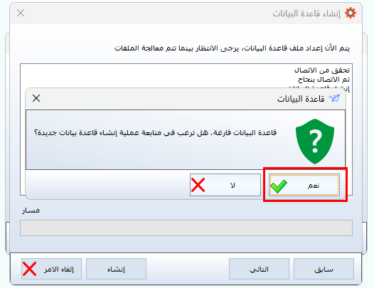 ستظهر رسالة تفيد بوجود قاعدة بيانات فارغة وتسأل عن الرغبة في المتابعة،