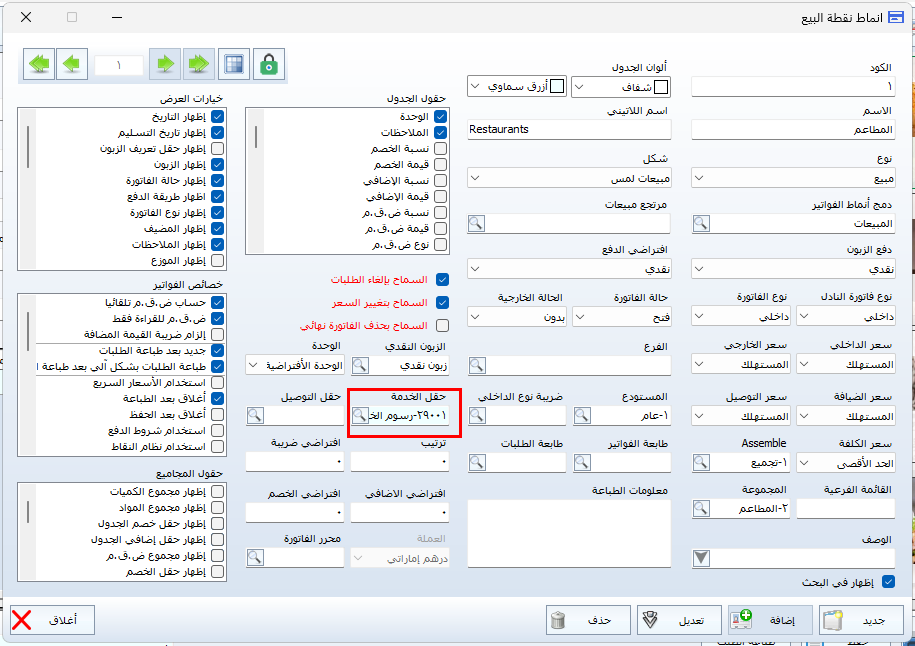 - اختيار المادة الخدمية التي سيتم استخدامها لاحتساب رسوم الخدمة (مثل: رسوم خدمة طاولة).