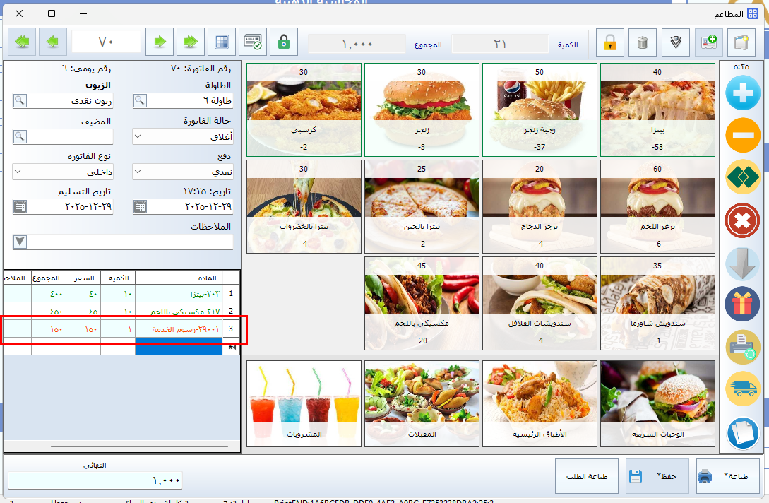 في هذه الحالة، يقوم النظام تلقائيًا بإضافة رسوم خدمة بقيمة 150 ريال إلى الفاتورة عند الإغلاق.