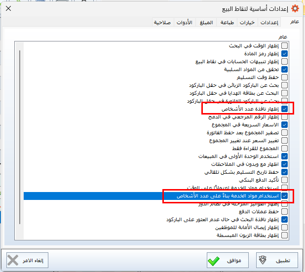 تفعيل هذين الخيارين يسمح للنظام باحتساب رسوم الخدمة تلقائيًا وفق عدد الأشخاص الجالسين على الطاولة.