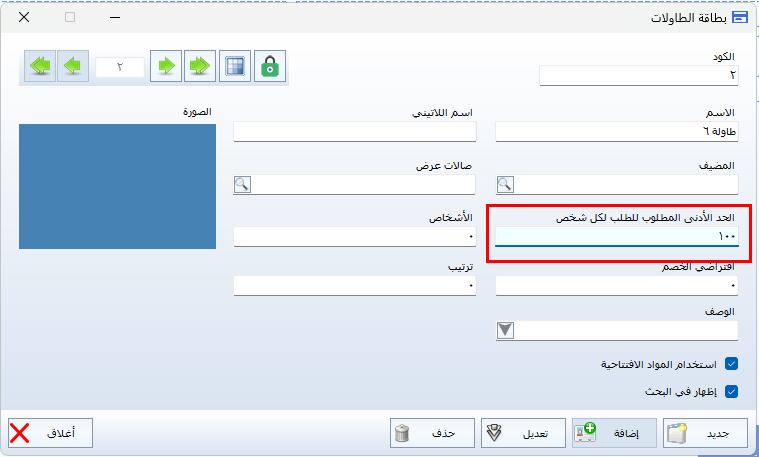 تُستخدم هذه الخاصية لفرض رسوم خدمة تلقائية تُحتسب لكل شخص على الطاولة في حال لم يصل مجموع الطلبات إلى الحد الأدنى المطلوب بناءً على عدد الأشخاص. وتُعد هذه الميزة مناسبة للمطاعم والمقاهي التي تعتمد حدًا أدنى للاستهلاك لكل فرد.