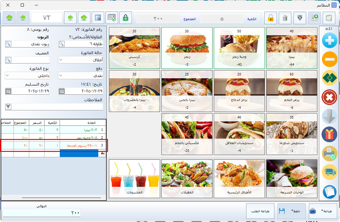 - يقوم النظام تلقائيًا بإضافة رسوم خدمة بقيمة 20 ريال إلى الفاتورة عند الإغلاق.