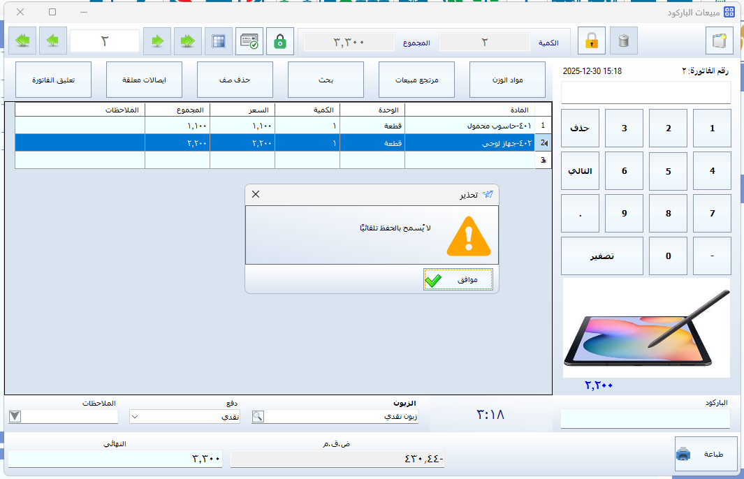 - هذا الإجراء يُلزم المستخدم بحفظ الفاتورة يدويًا قبل إغلاق النافذة، مما يمنع ترك أي فاتورة مفتوحة دون متابعة.