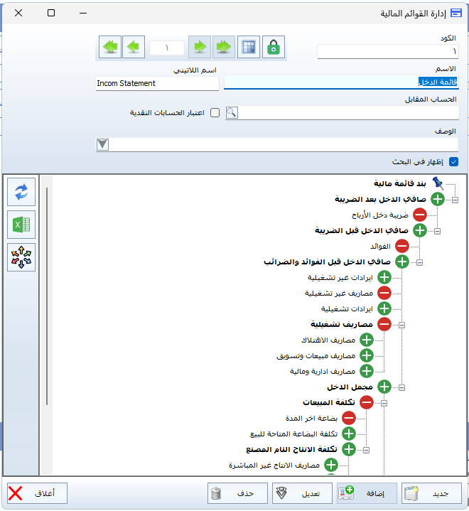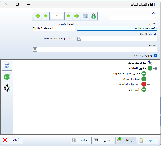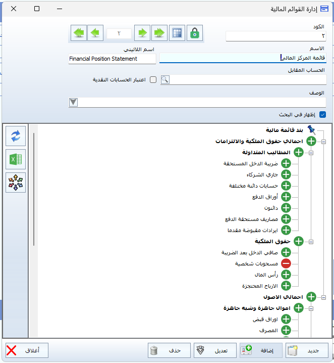 هي أداة مخصّصة داخل النظام تُمكّن المستخدم من إنشاء وتنظيم وإدارة تقارير القوائم المالية بشكل مرن ومنهجي. تعمل هذه الأداة كبطاقة إعداد يتم من خلالها تخصيص كل قائمة مالية وربطها بتقرير معيّن، بما يتوافق مع هيكل الحسابات والسياسات المحاسبية المعتمدة في المنشأة.