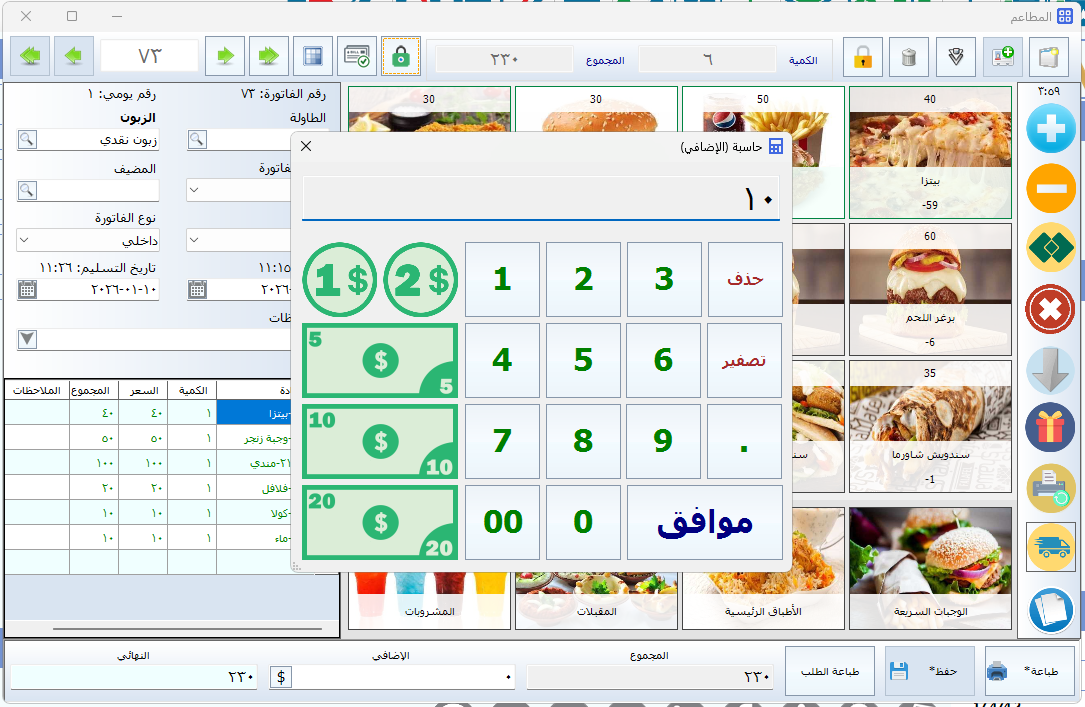 عند الضغط على زر توصيل في واجهة الفاتورة، ستظهر حاسبة رسوم التوصيل تلقائيًا، مما يسمح للكاشير بإدخال قيمة الرسوم يدويًا حسب المنطقة أو حسب الطلب.