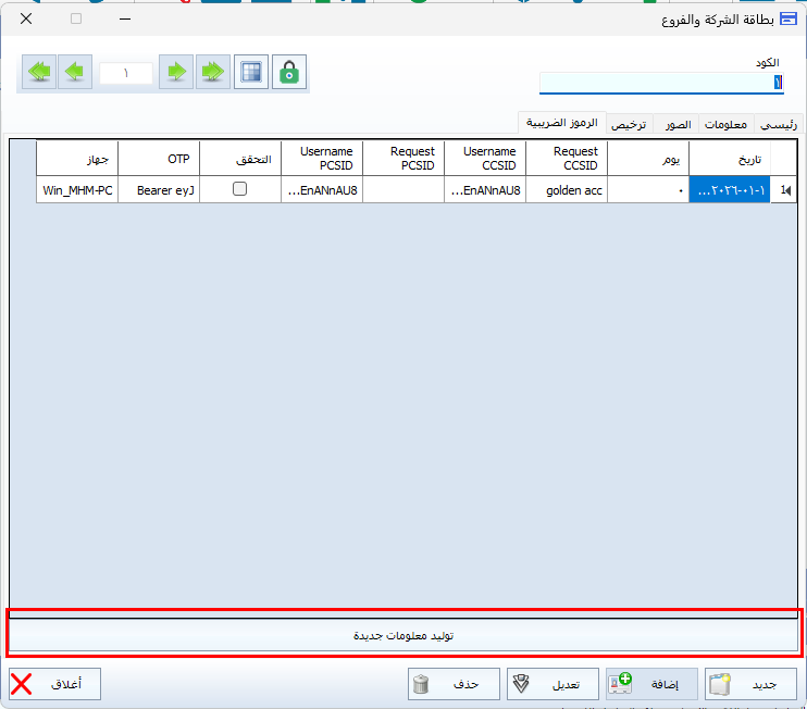 - الدخول إلى نافذة الرموز الضريبية، ثم الضغط على خيار توليد معلومات جديدة.