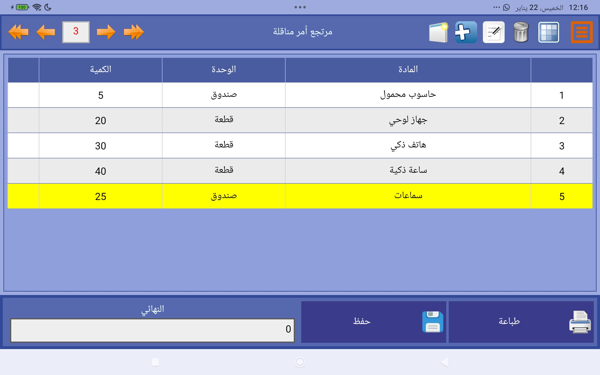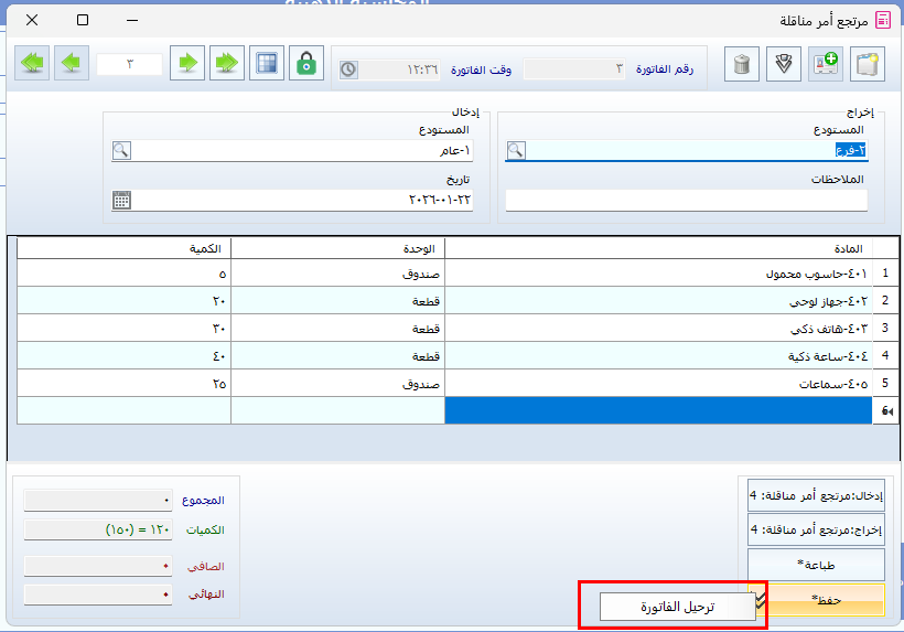 - بعد مراجعة الكميات، يتم الضغط على حفظ لإضافة أمر المرتجع.