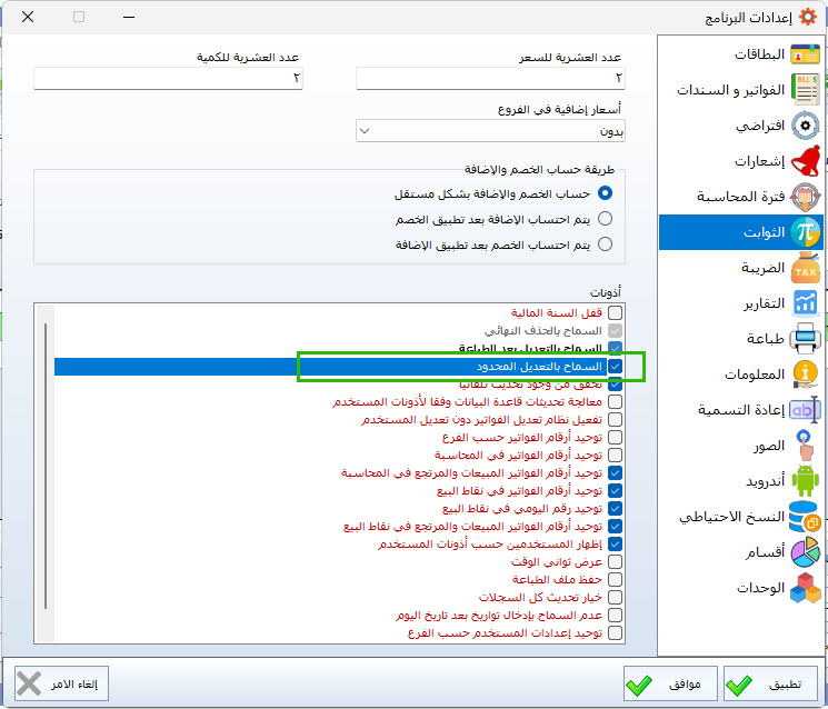 حيث يتيح هذا الخيار السماح بتعديل بعض الحقول المحددة فقط، مثل المستودع أو مركز الكلفة، دون المساس ببقية بيانات الفاتورة.