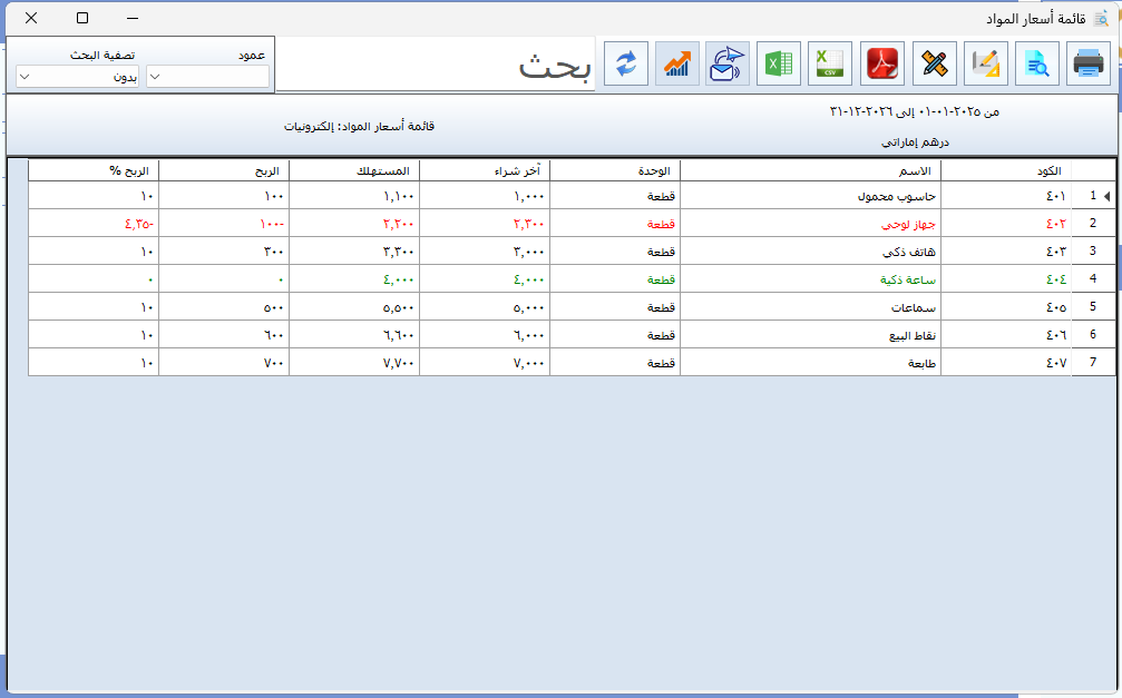 كما يوضّح التقرير أسعار المواد ابتداءً من سعر الكلفة وصولًا إلى سعر البيع للمستهلك، الأمر الذي يمكّن الإدارة من مقارنة الأسعار، ومتابعة هوامش الربح، واتخاذ القرارات المناسبة بشأن التسعير والتخطيط المالي.