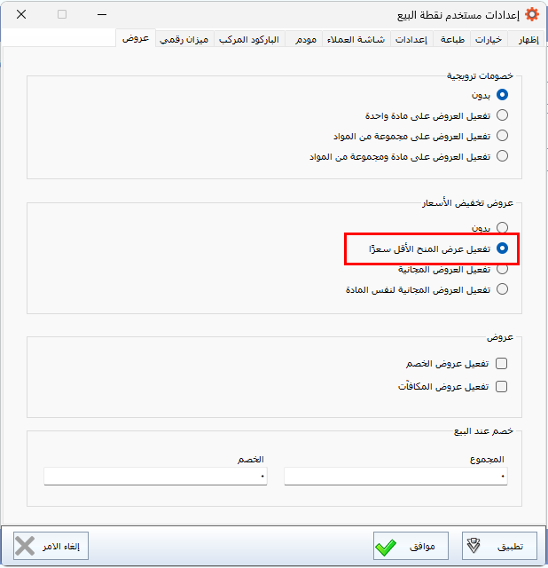 - من إعدادات المستخدم يتم كذلك تفعيل خيار العروض – منح الأقل سعرًا.