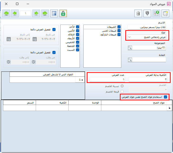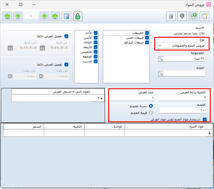 - من بطاقة العروض يتم إضافة عرض منح وخصومات.
