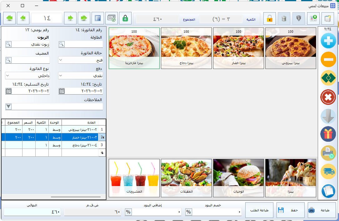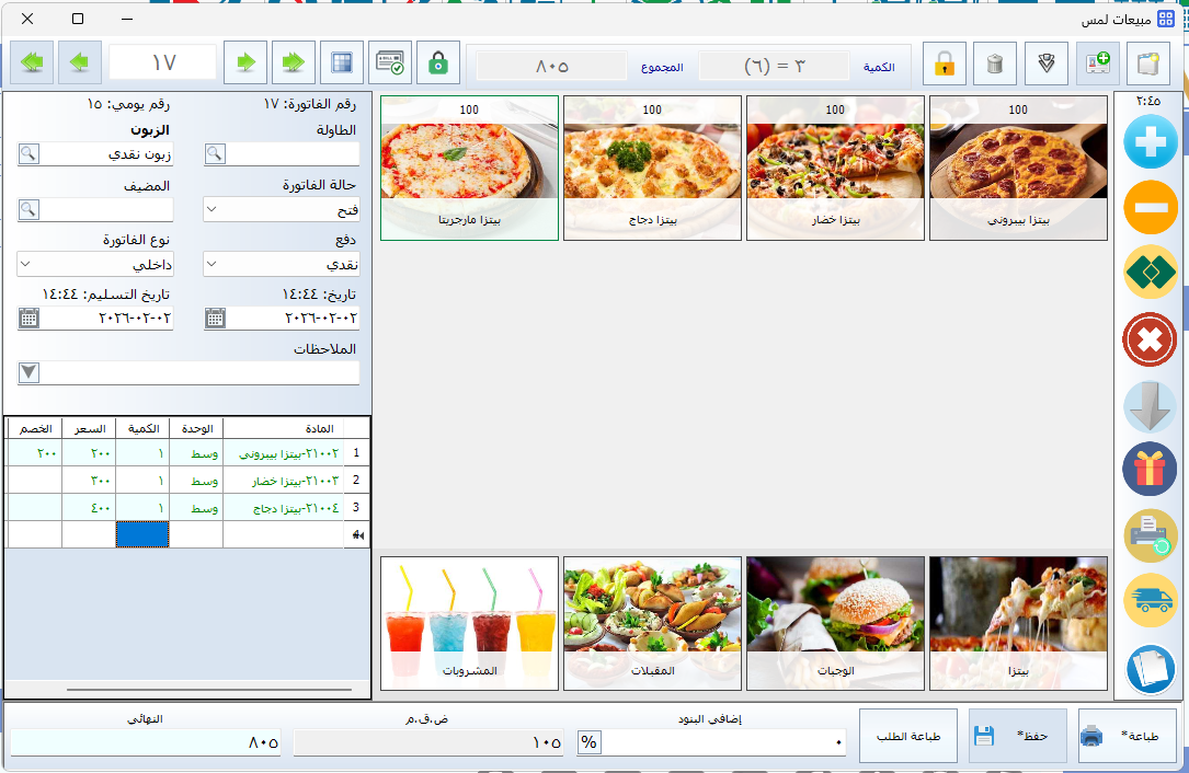 - عند قيام الزبون بشراء ثلاث بيتزات، يقوم النظام تلقائيًا بتطبيق خصم يعادل سعر أقل بيتزا من حيث السعر، وتُحتسب هذه البيتزا على أنها مجانية.