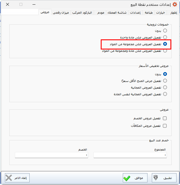 - من إعدادات المستخدم يتم تفعيل خيار العروض على مجموعة من المواد.
