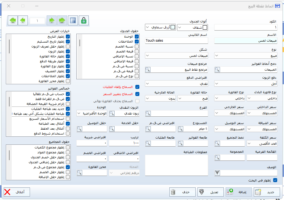 كما يمكن من خلال هذه الإعدادات التحكم في إظهار أو إخفاء بعض الخيارات داخل شاشة نقاط البيع بما يتناسب مع طبيعة العمل ويسهّل على المستخدم عملية إدخال الفواتير بسرعة ودقة.