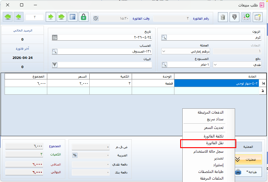 الخطوة الثانية: نقل الطلب إلى فاتورة مبيعات