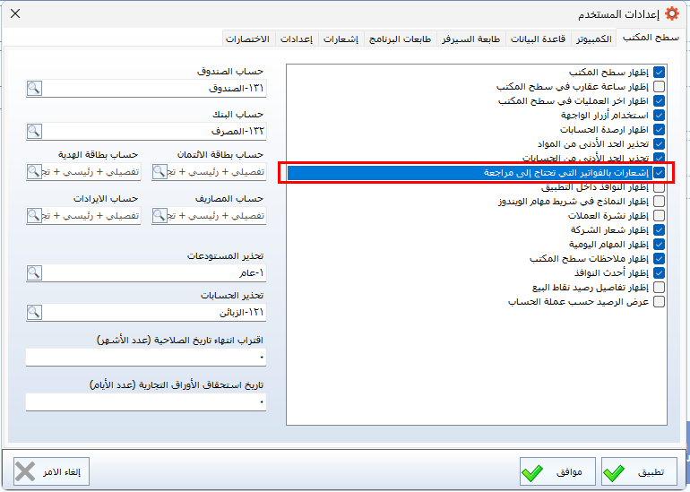 يمكن تفعيل تنبيهات على سطح المكتب لعرض الفواتير التي لم يتم تجهيزها أو استكمالها بعد. يتم ذلك من خلال إعدادات سطح المكتب، مما يساعد المستخدم على متابعة الطلبات المتأخرة واتخاذ الإجراءات اللازمة في الوقت المناسب.